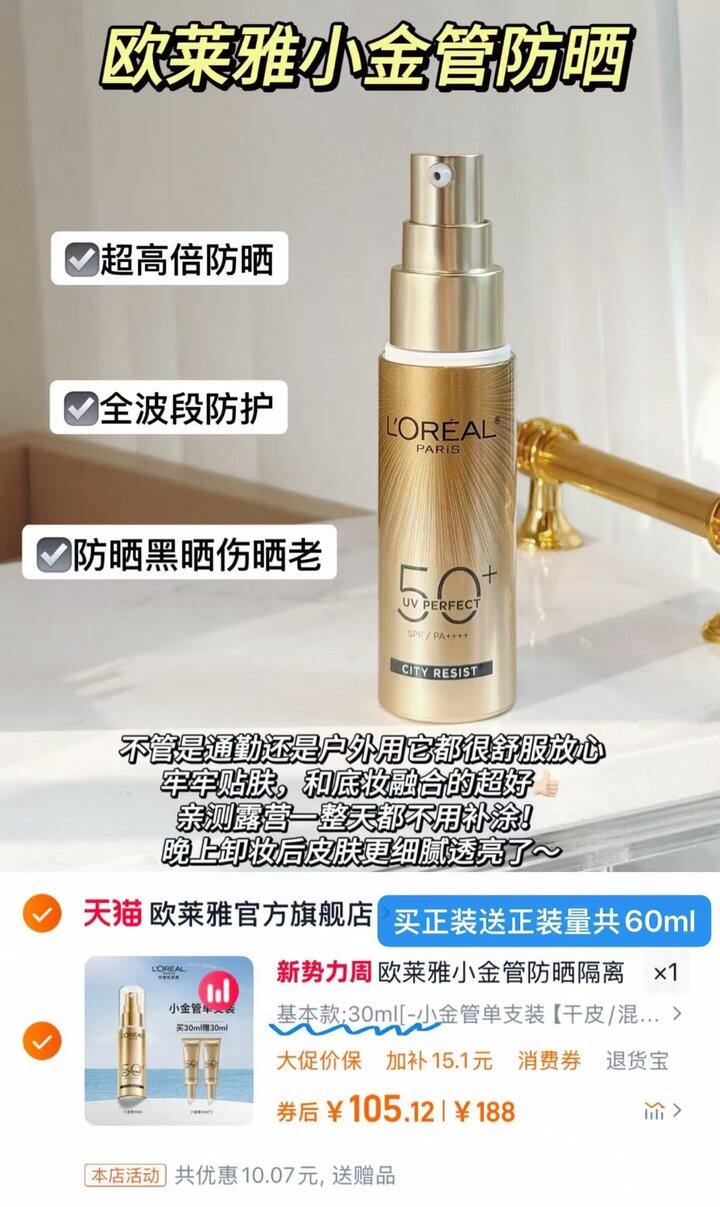 好用!欧莱雅小金管防晒乳,52