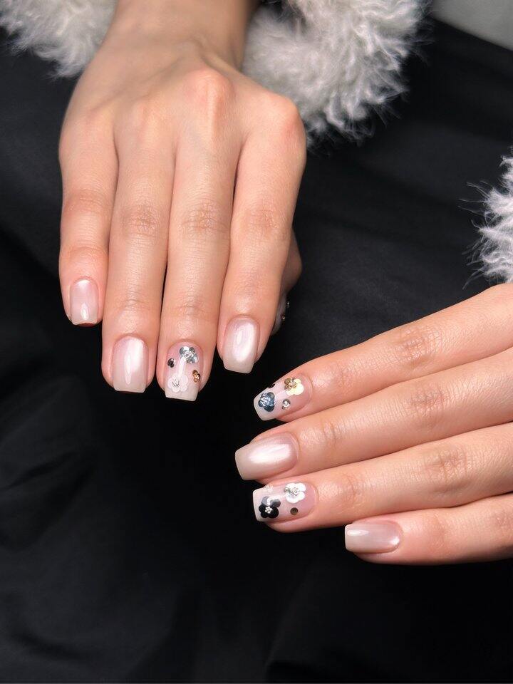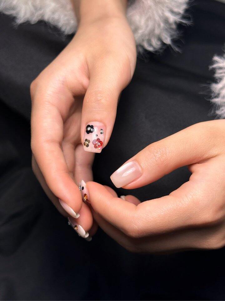 做的时候内心小忐忑,第一次碰到那么多颜色聚集在自己的指甲上,四小时以后看到成品内心缓了一口气。