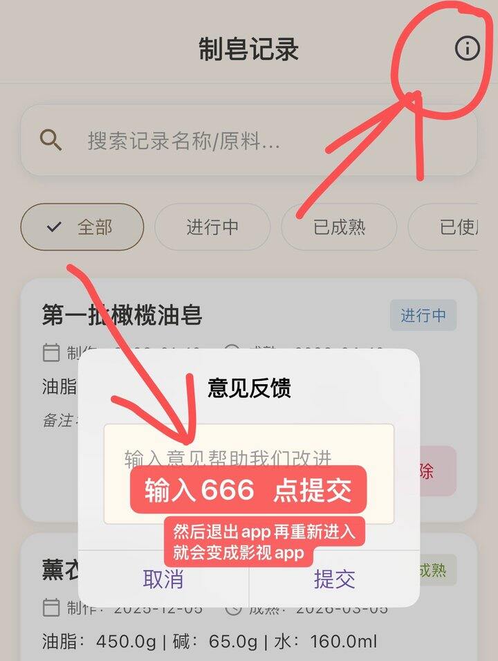 打开app后点击右上角感叹号,跳出意见反馈,输入“666”点提交,退出app再重新进入就变成了影视app,里面资源很全,还能投屏~