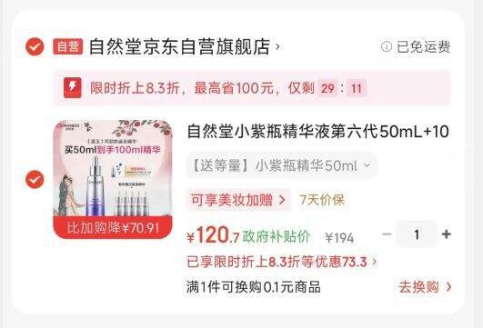 JD【凑单120.70】自然堂.小紫瓶精华液第六代50mL+赠10ml*5,需要商品页弹83折限时立减,凑单价,叠加plus会员券和政府补贴
