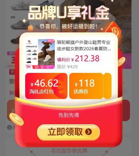 TB【142.85】骆驼.熊猫户外轻量化登山鞋,需要有23元首单金,叠加88会员200-25消费券,如有弹限时红包更便宜