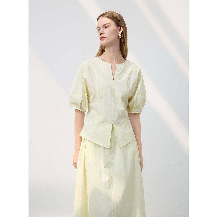 三彩2025夏季新款极简风套装长绒棉泡泡袖高腰A字裙淡人两件套女S
