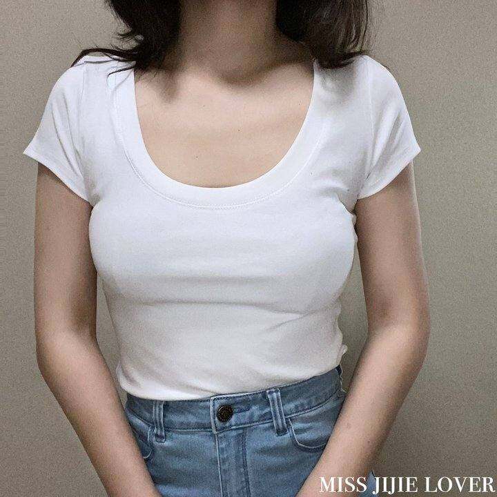 missjijielover 正肩高弹力大圆领全棉修身显瘦纯色短袖T恤打底衫