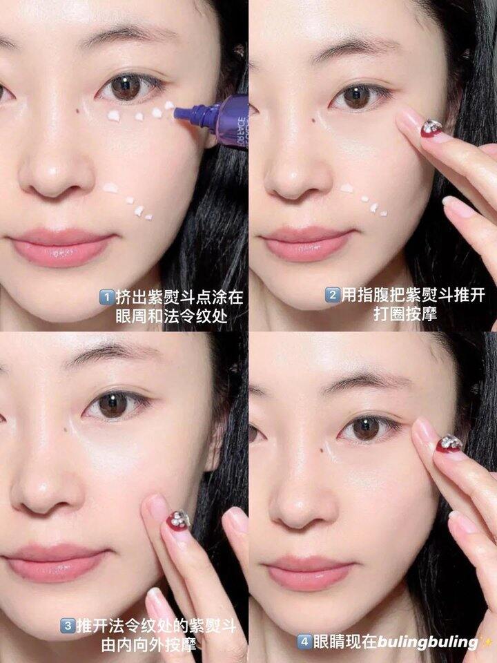 既是眼霜也是面霜全脸都能用哦~✅眼点图于眼周,配合按摩头推开✅面由眼及脸,覆盖面部重点纹路✅提拉按摩,对抗顽固颈纹