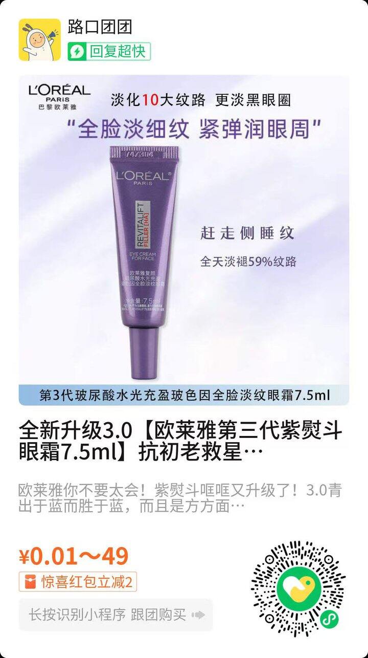 欧莱雅第三代紫熨斗眼霜7.5ml *4支 领取惊喜红包到手47元(是小样,大家注意查看,介意勿拍)
