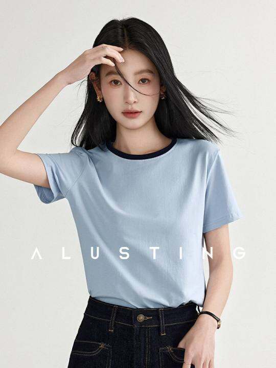 艾路丝婷2025年夏季新款简约纯色休闲撞色圆领上衣女装宽松减龄