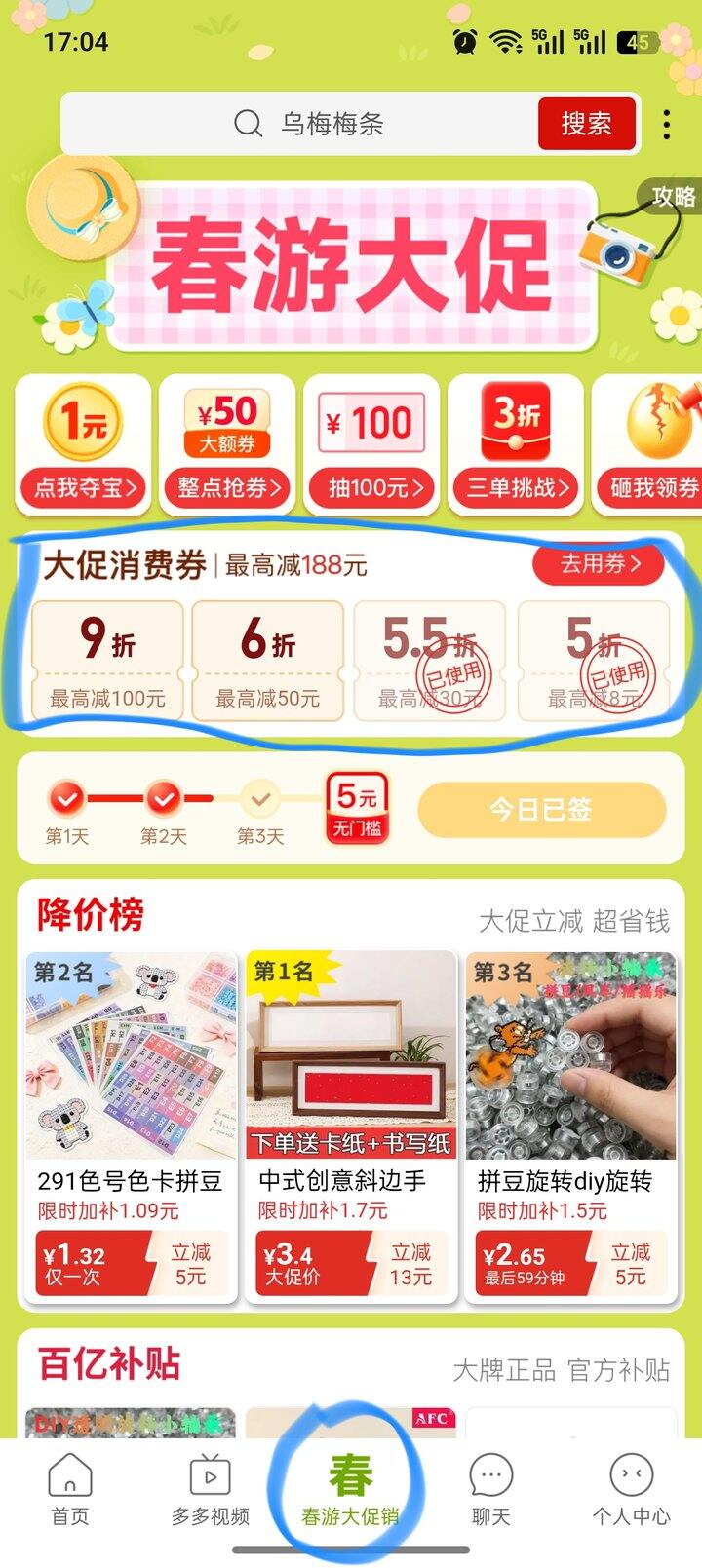 一个是从底部中间点进去,有个大促消费券,里面有四种折扣的券,我一般用5折和55折的。