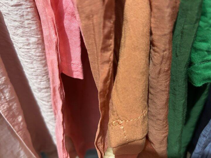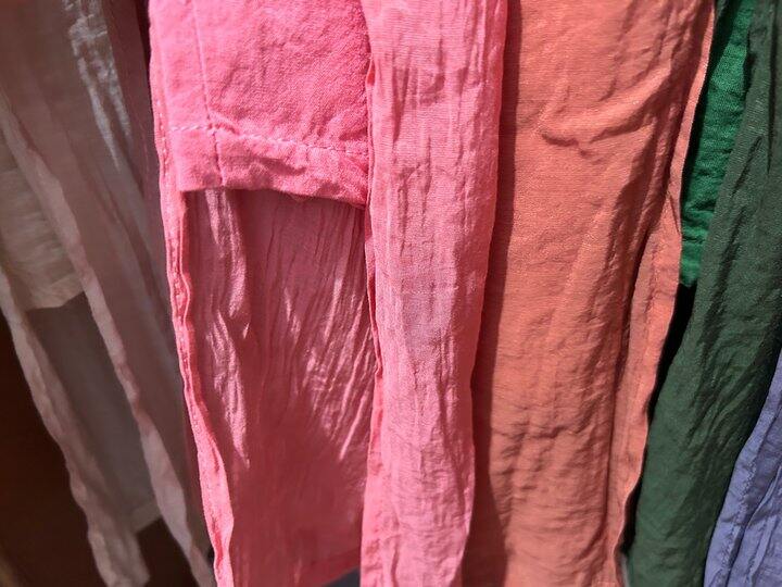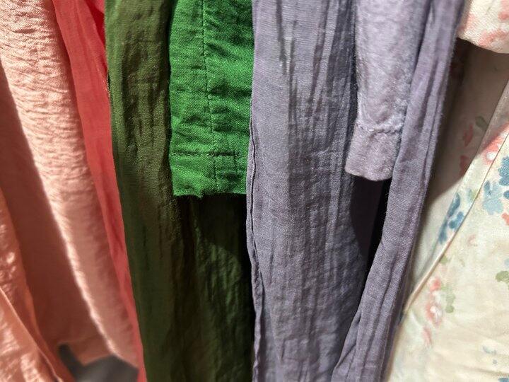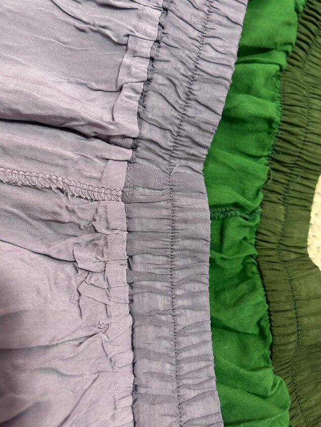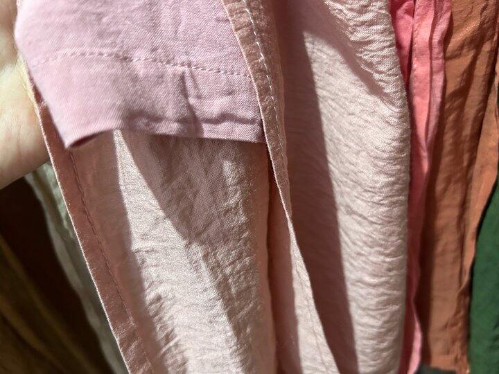 绿色和紫色一个是天丝麻,一个是棉麻的,能看出区别来吗?绿色内衬的孔隙稍微大一丢丢。紫色的内衬,感觉更柔软光滑。