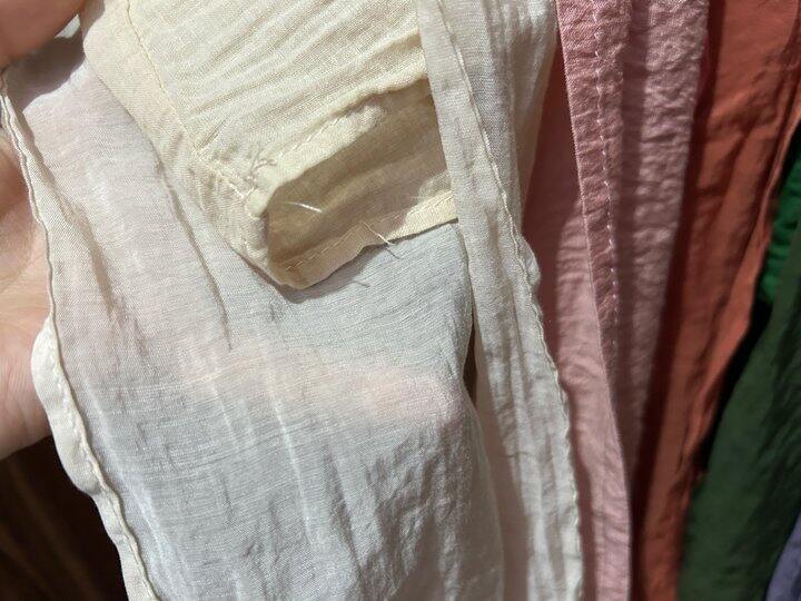 米白的内衬锁边最细,其他的都是那种稍微有些宽的锁边,比较平整,这几条裤子都有这种线头。