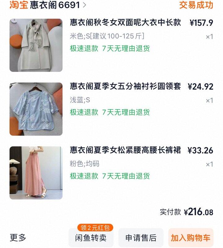 惠衣阁这件感觉质量做工最好。但是也属这件最肥大。我用衣架晾的时候,腰侧两边就有点点鼓包了,看来得用夹子夹着晾