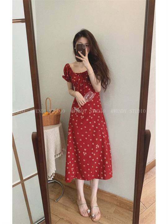 WENDY独家法式复古方领显白酒红色印花连衣裙女夏气质显瘦中长裙