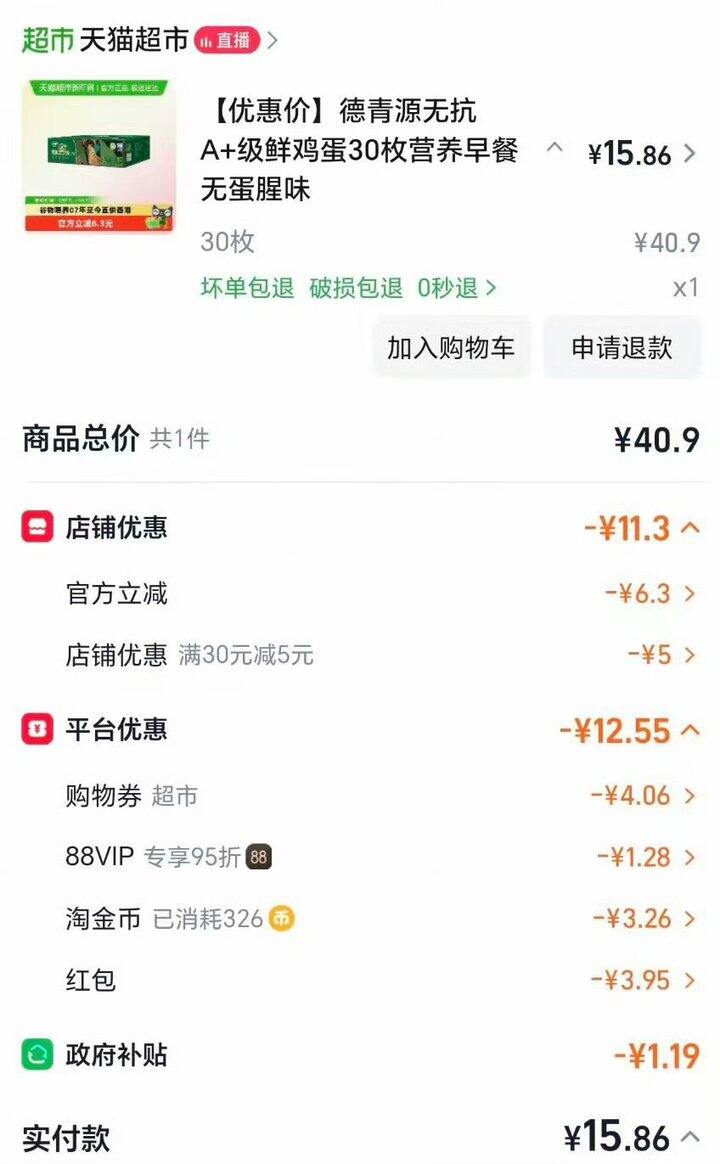 ❸ 返回🛒,2款分别拍1件,德青源页面有品牌立减2,88vip叠加国补拍1件15.89