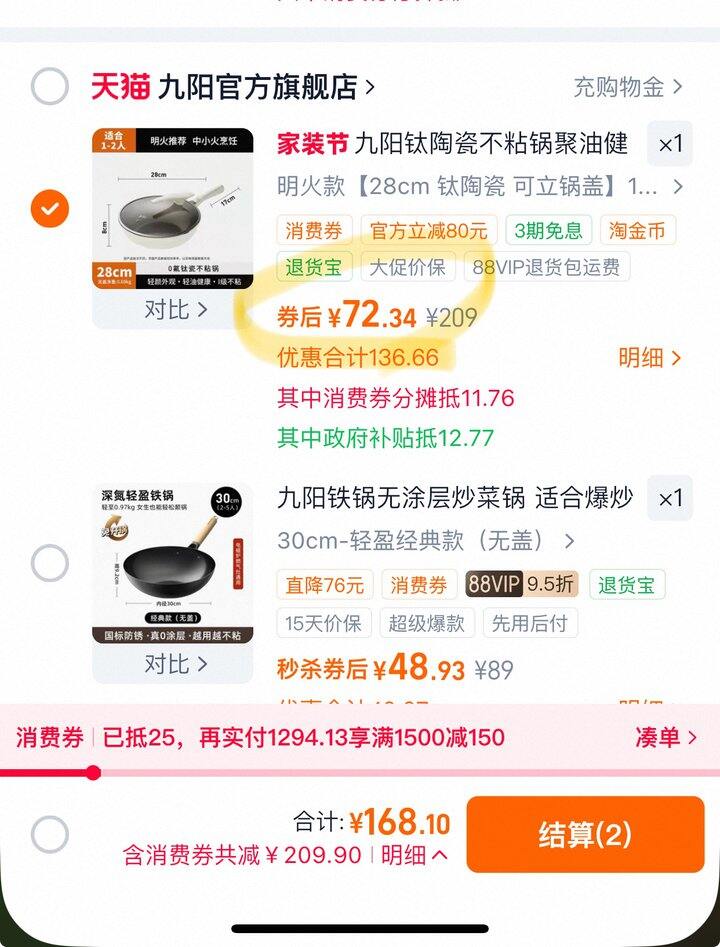 最近很流行钛锅,凑200-25消费券叠加国补到手72.34,晒图返10到手62.34