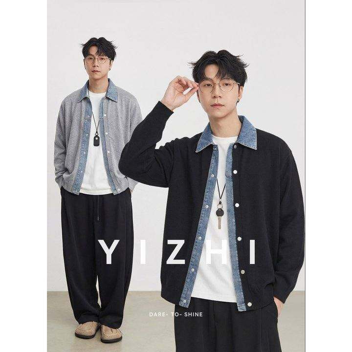 亦止韩系复古牛仔拼接翻领针织开衫春季新款宽松痞帅男士拼接外套