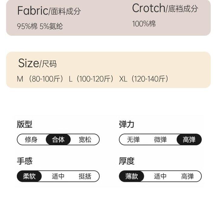 黄金比例的材质,选用95%棉+5%氨纶的纺织面料符合国家纺织品A类标准跟婴幼儿贴身衣物是同一个级别的唷,为了健康着想,内裤这种贴身衣物一定得选A类级别的!