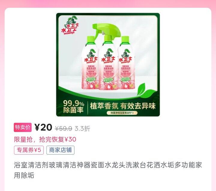 这款清洁玻璃/水龙头/洗漱台等特别好用!清洁后亮晶晶的,今年换王一博代言了,慢慢忦格就要涨上去了,趁秒杀赶紧囤!