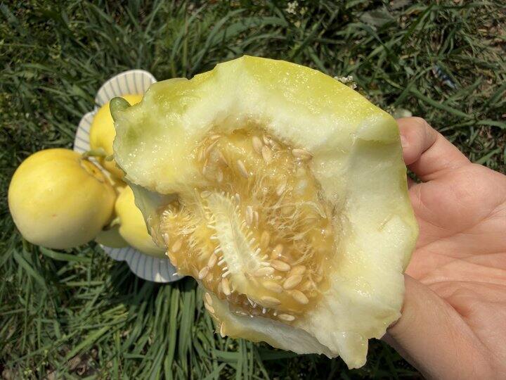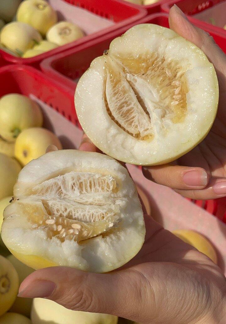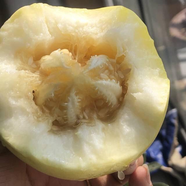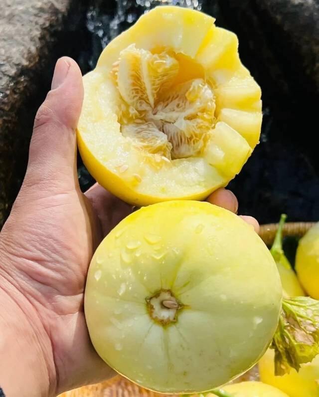 瓜表皮色泽奶白黄金,瓜瓤果肉厚实细腻,可食率达到98%以上,每一口都是饱满充足的果肉,口感层次非常丰富。比起其他瓤多,皮厚,味寡淡的蜜瓜,这一款是绝对的最佳选择~