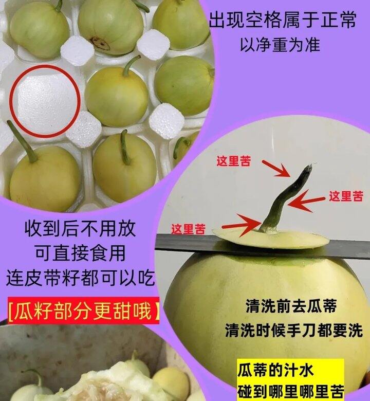 注意:【⚠️食用指南】瓜蒂部位会有点发苦属于正常现象,是由于瓜蒂处营养元素聚集所致,不影响食用想分食的小伙伴,吃之前可先将瓜蒂部位切除,以免影响口感体验🐝蜜蜂甜瓜成熟度越高中间瓜瓤会越空,在快递运输过程中有摔件现象,这样就导致中间的瓜瓤会出现淌瓤现象,这种不是坏的,不影响口感和食用~