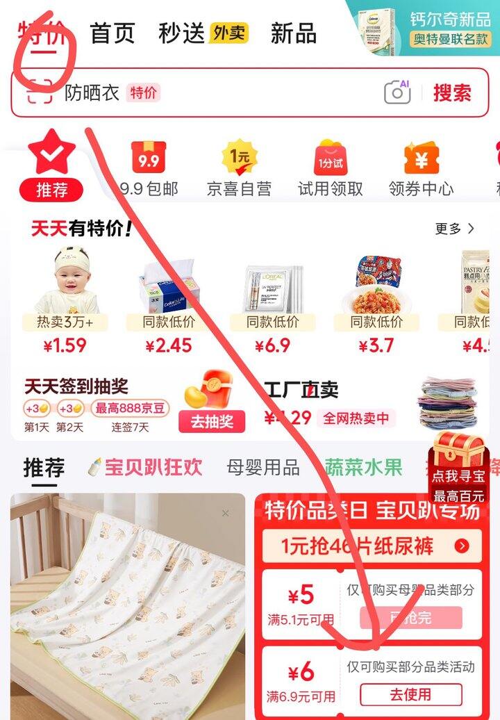 如图京东首页顶部点特价领取6券