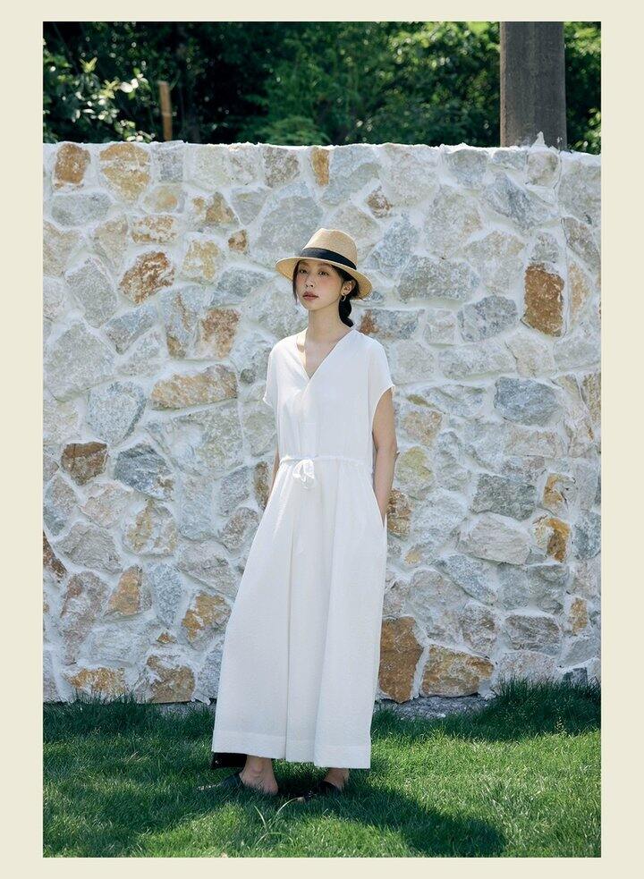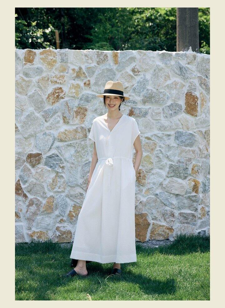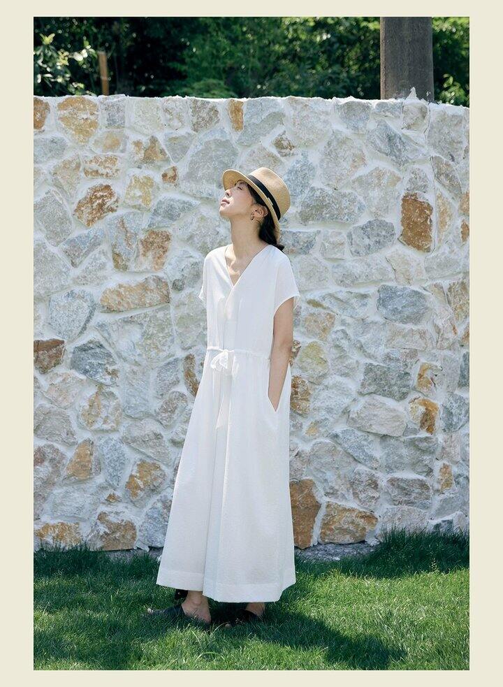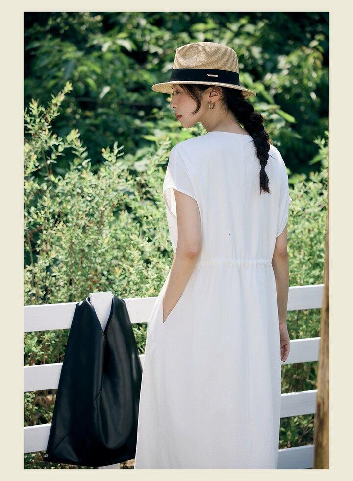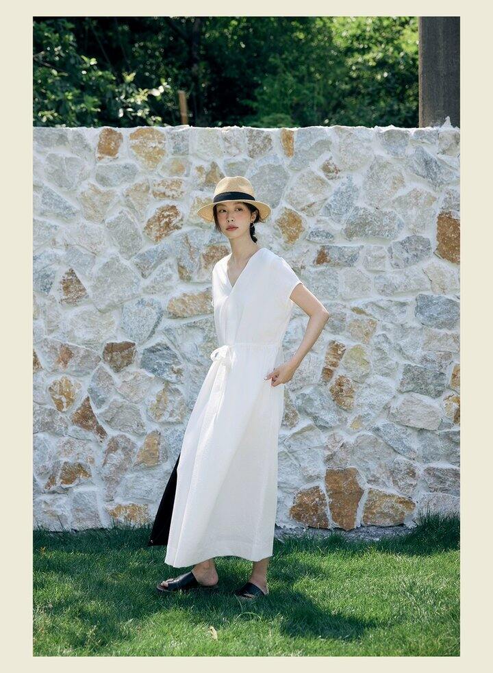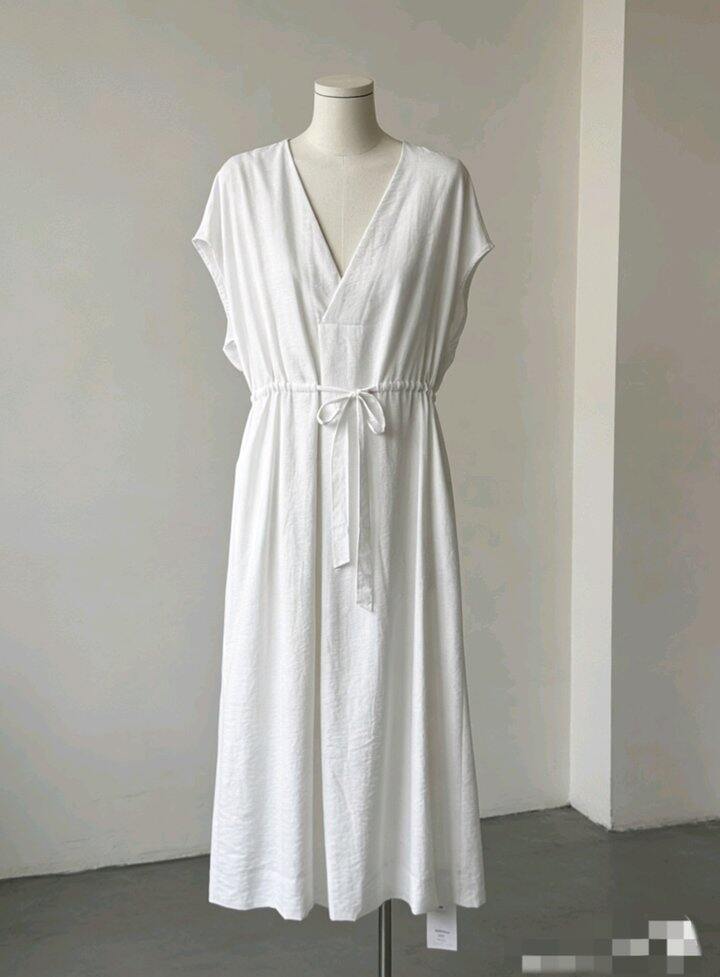 HU006 「我在闲鱼发布了【全新有吊牌法式 V 领棉麻落肩款连衣裙收腰显瘦气质百搭长裙均】」