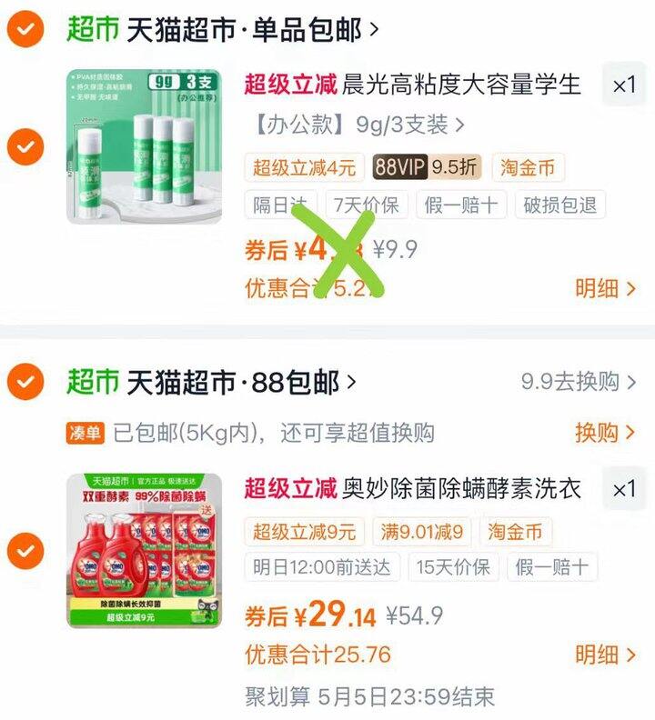 ❹ 返回🛒,2款分别拍1件,奥妙洗衣液页面有品牌立减2,到手29.14
