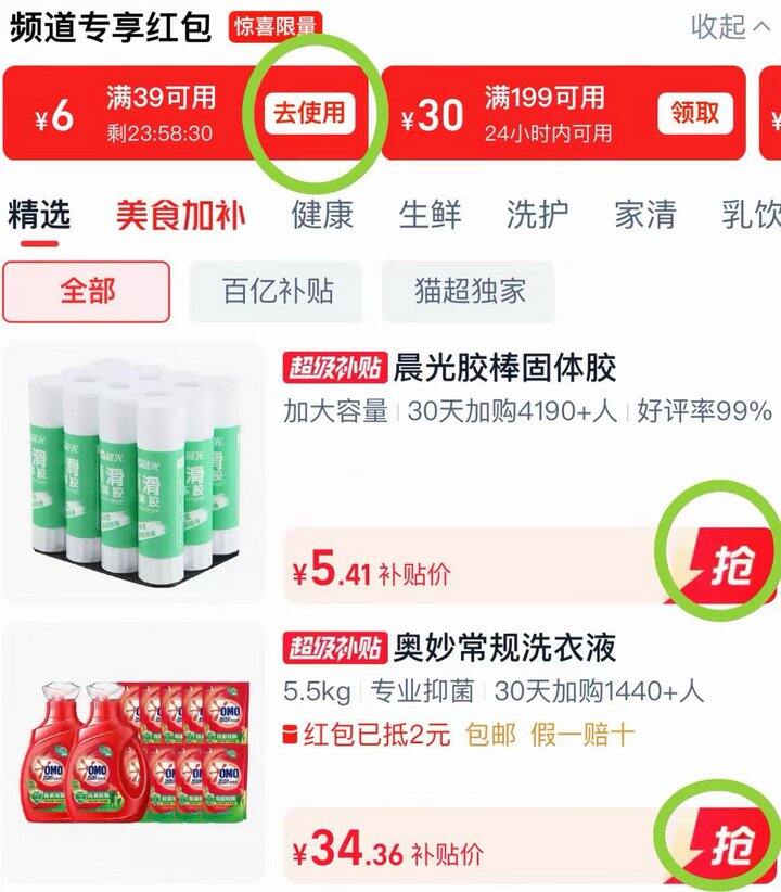 ❸ 去天猫超市首页-超级补贴频道领39-6红🧧