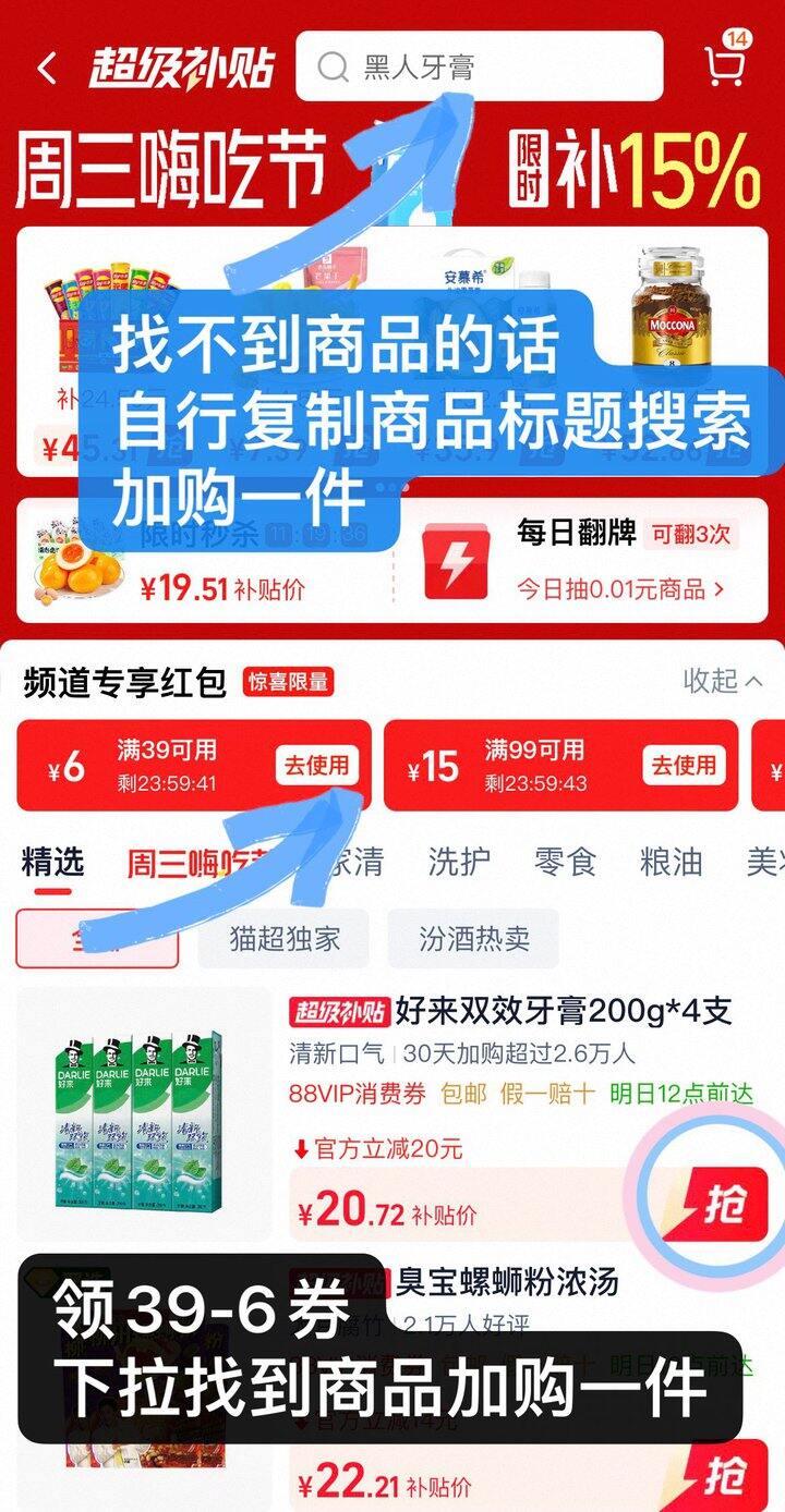 ❷如图进入超级补贴领39-6红包🧧,搜再加购