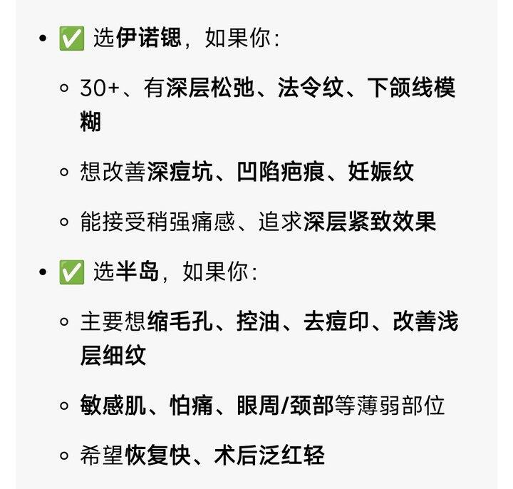我看了一下网上说的,没有绝对的哪个好,想深层抗衰/痘坑选伊诺锶(再希斯);想温和、缩毛孔、敏感肌/怕痛选半岛五代(我做的4代 又疼些)