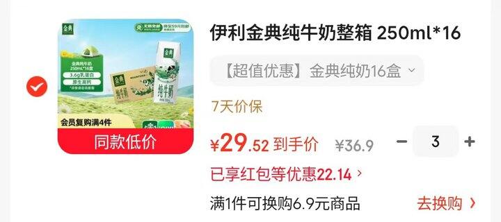 伊利金典纯牛奶250ml*16盒💰29.5