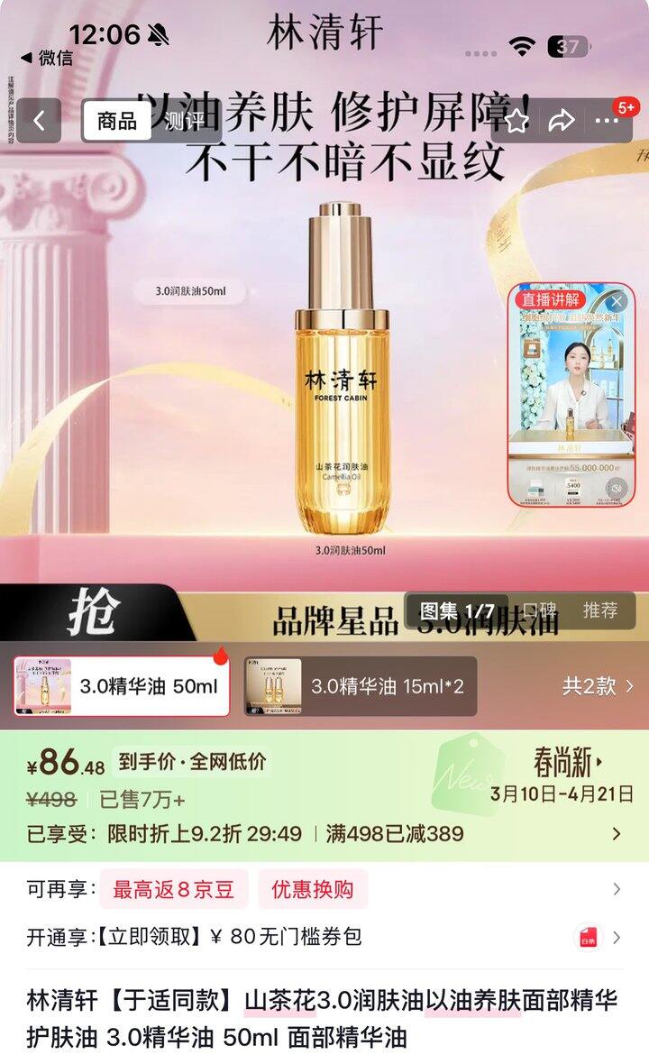林清轩山茶花3.0精华油50ml💰86元