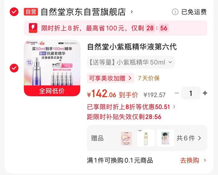 小紫瓶自带 15 首购礼金,浏览弹 8 折限时优惠 ,100ml 小紫瓶精华拍下 142.06💰