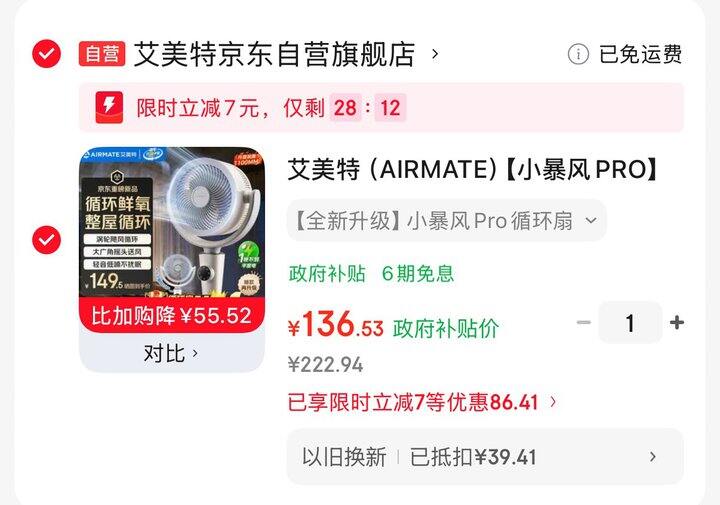 💰86.53元 艾美特 小暴风PRO 空气循环扇