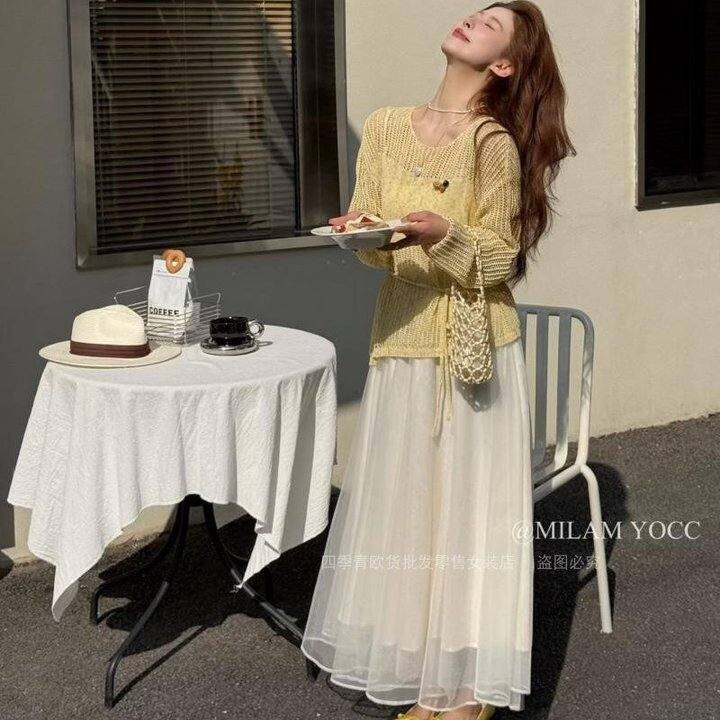 谜兰原创2026春季新款法式气质镂空上衣女网纱半身裙时尚两件套装