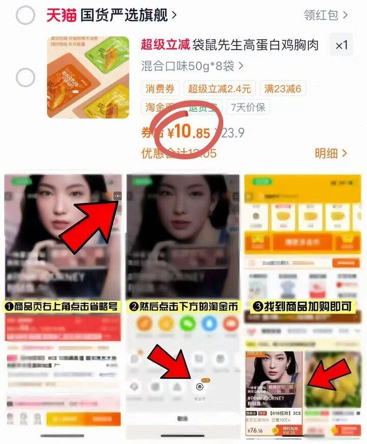 即食很方便!𝟏𝟎🉐𝟖袋快!按图二的步骤叠加淘金币抵扣价格正确✅:
