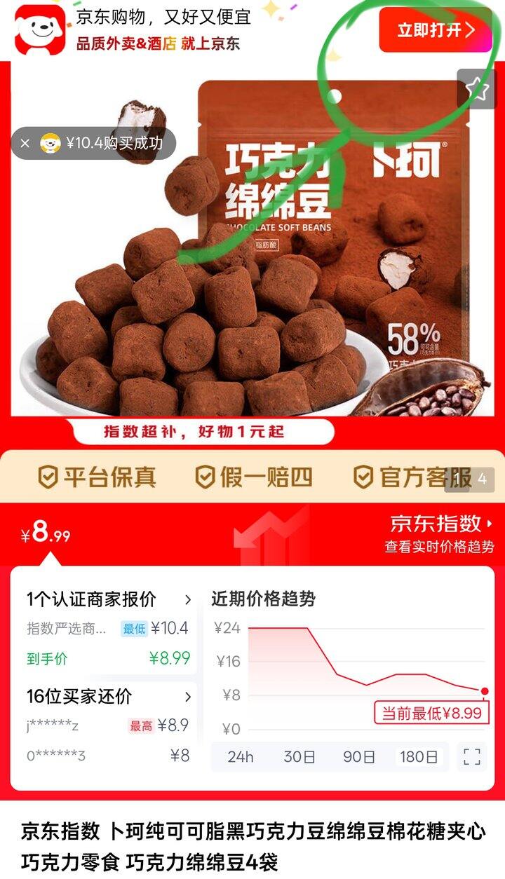 【京东】卜珂纯可可脂黑巧绵绵豆4袋