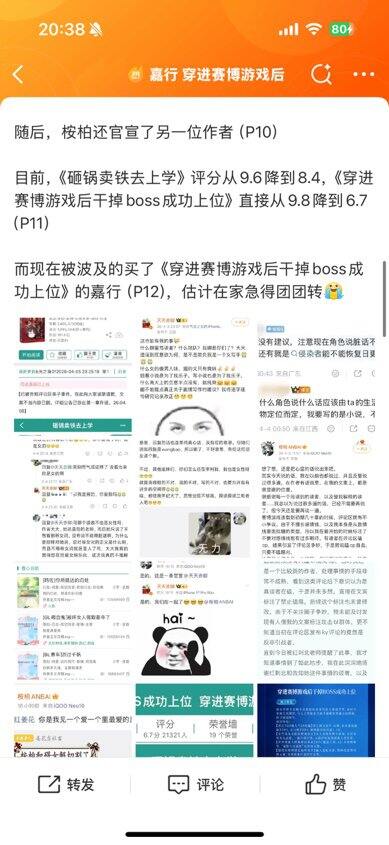 这几天因为红刺北(砸锅卖铁作者)和桉柏(赛博作者)阴阳怪气背刺粉丝直接给《赛博》评分干到6.5了,甚至还在不停下跌。