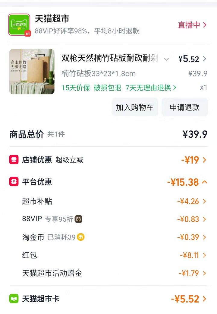 双呛天然楠竹砧板33*23*1.8cm,领2李金,叠2福袋,到手7块多,