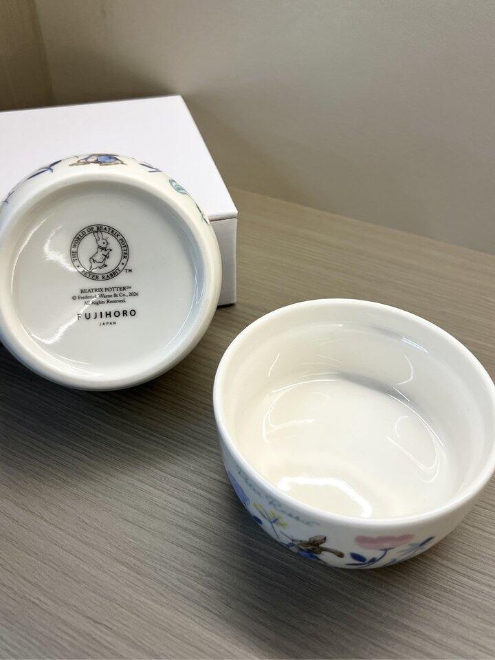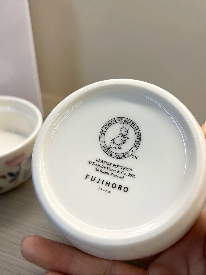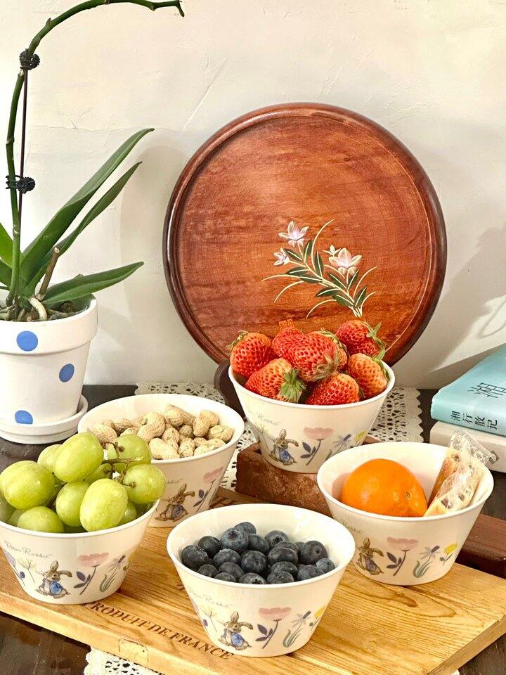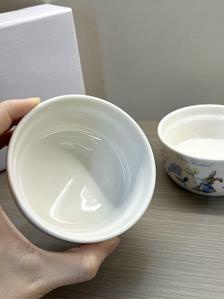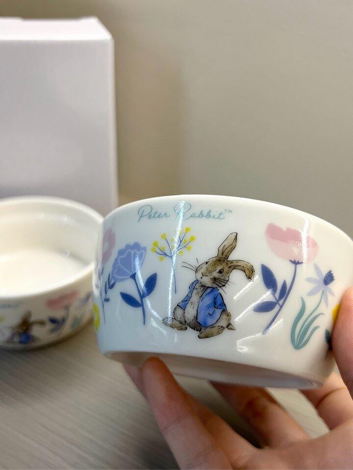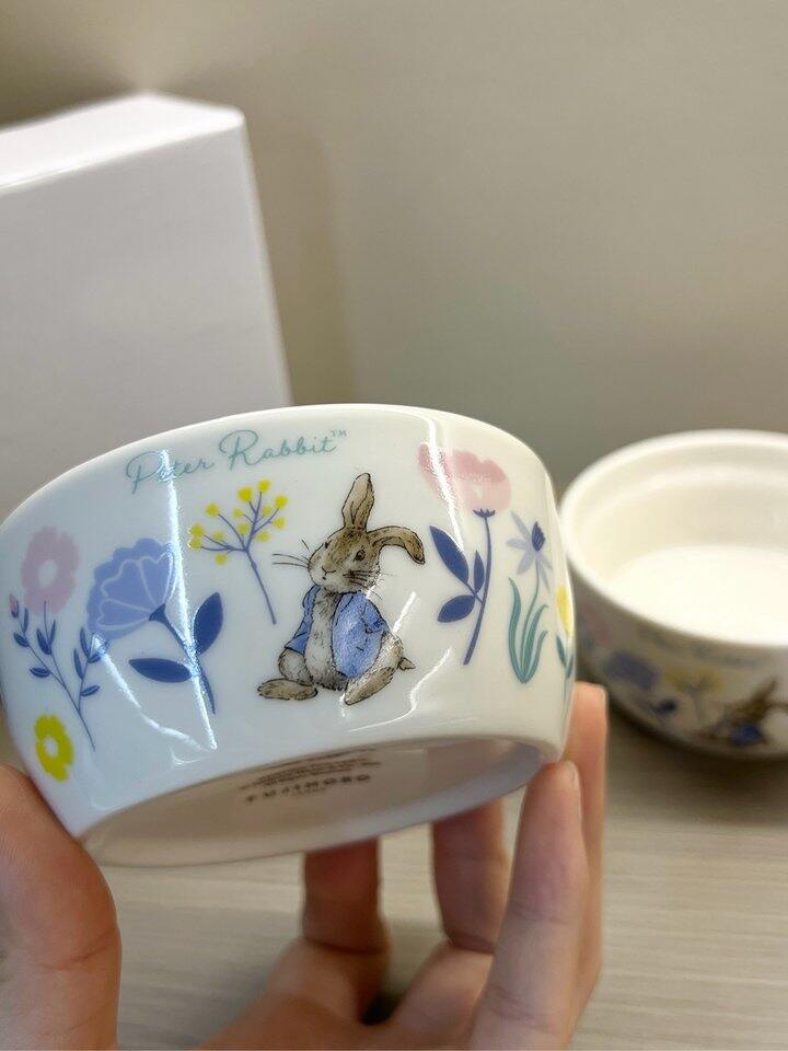 高温陶瓷材质,奶白瓷身印着穿蓝外套的小兔+手绘花草,可作为餐碗 汤碗 水果杯碗使用