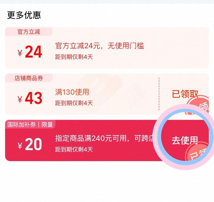 ❸看图标题下领240-20加补券