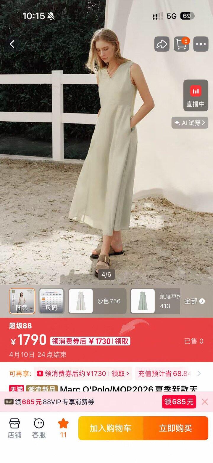 北欧品牌Marc O polo无袖V领连衣裙,面料法国进口亚麻,成份100%