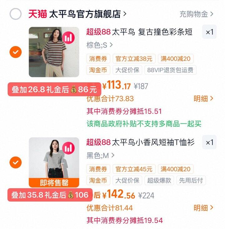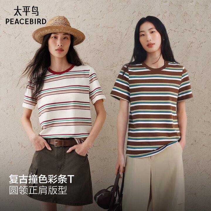 ❸太平鸟复古撞色彩色条纹短袖T恤💰86元