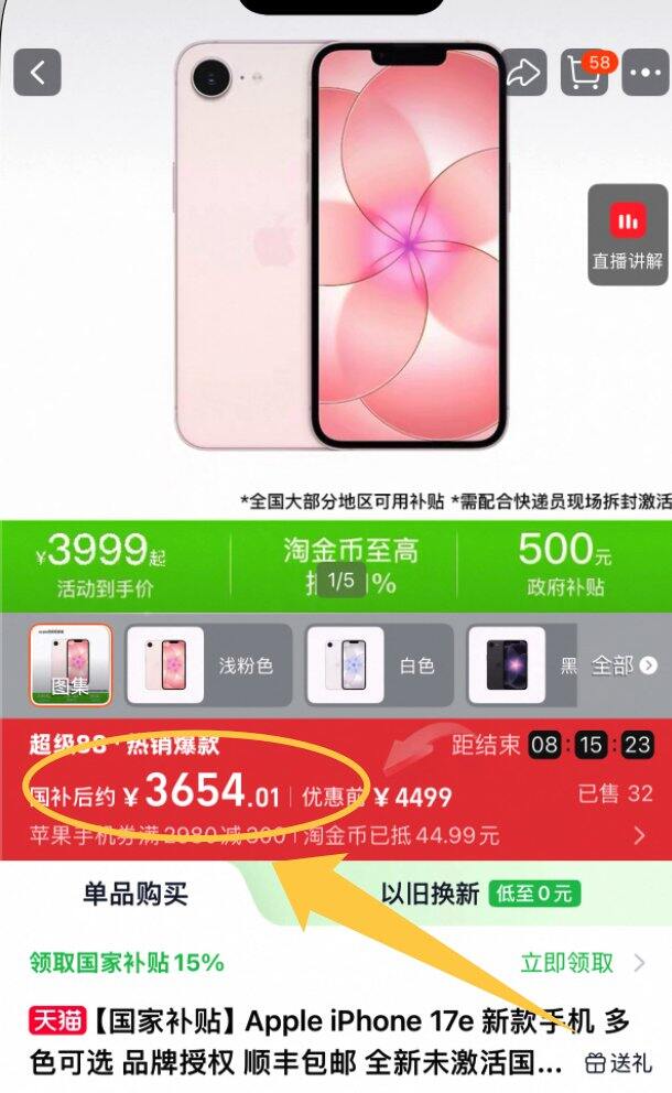 苹果 17E,256G,领取商品详情第一个-300 的优惠券.叠加国补,到手 3654 左右.👉