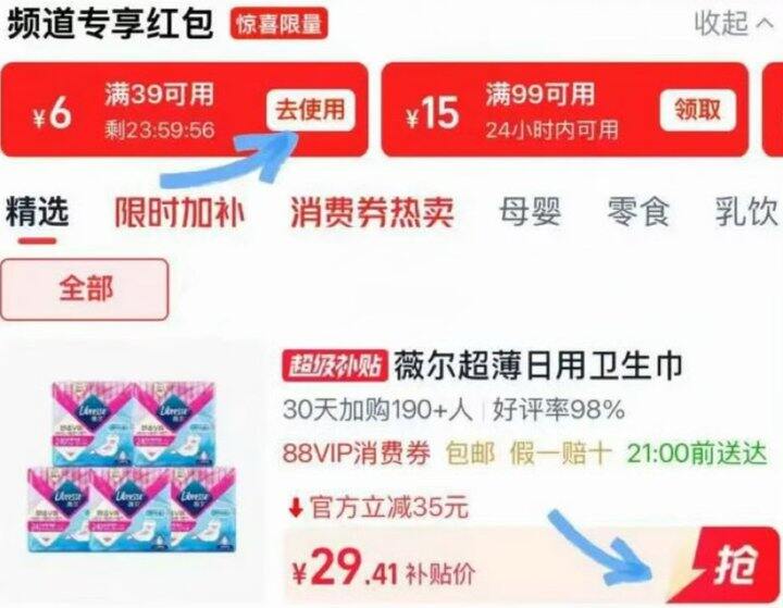 ❷ 下拉详情页点超级补贴,跳转后领39-6红🧧,频道下拉找到薇尔,页面有品牌立减7,
