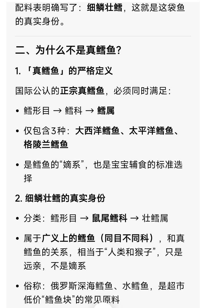 我朋友说她家山姆买的鳕鱼宝宝不爱吃,我说我家盒马买的一款,宝宝还挺爱吃的,她问我是哪款?前面也不知道咋想的,就去查了查,结果发现只是广义上的鳕鱼(同目不同科)😂