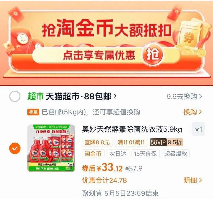 奥妙全自动含金纺洗衣液19.8斤,拍下74,反20清洁津贴,到手54💰2.7/斤