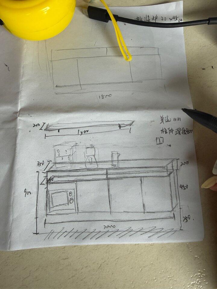没有做背板用的拉条固定,因为做了开放格放微波炉,需要散热,柜门到底是下翻还是平开还没想好但我感觉下翻可能性大点