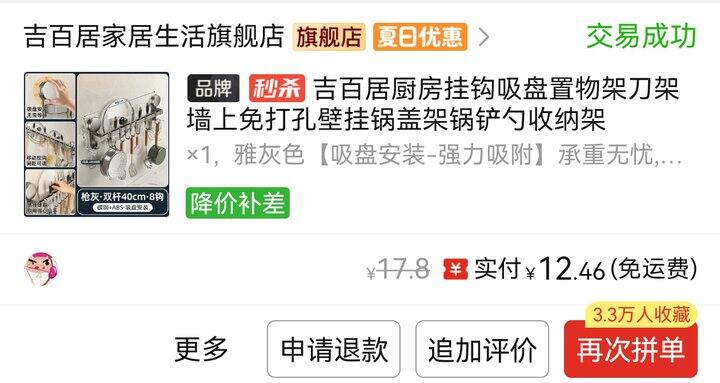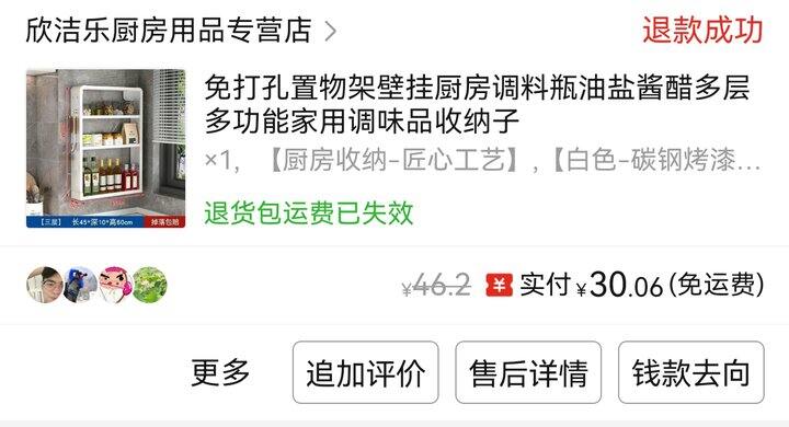 这个收纳架很实用,显示退款成功是因为他给我的像是被别人用过一样,有使用痕迹,然后给我退了几块钱。唯一有一点点不太好的,就是它的那个隔板都是实的,没有漏水孔,我把它放浴室用了,不会漏水,南方回南天,然后很容易发霉,擦完之后还要手动排水。