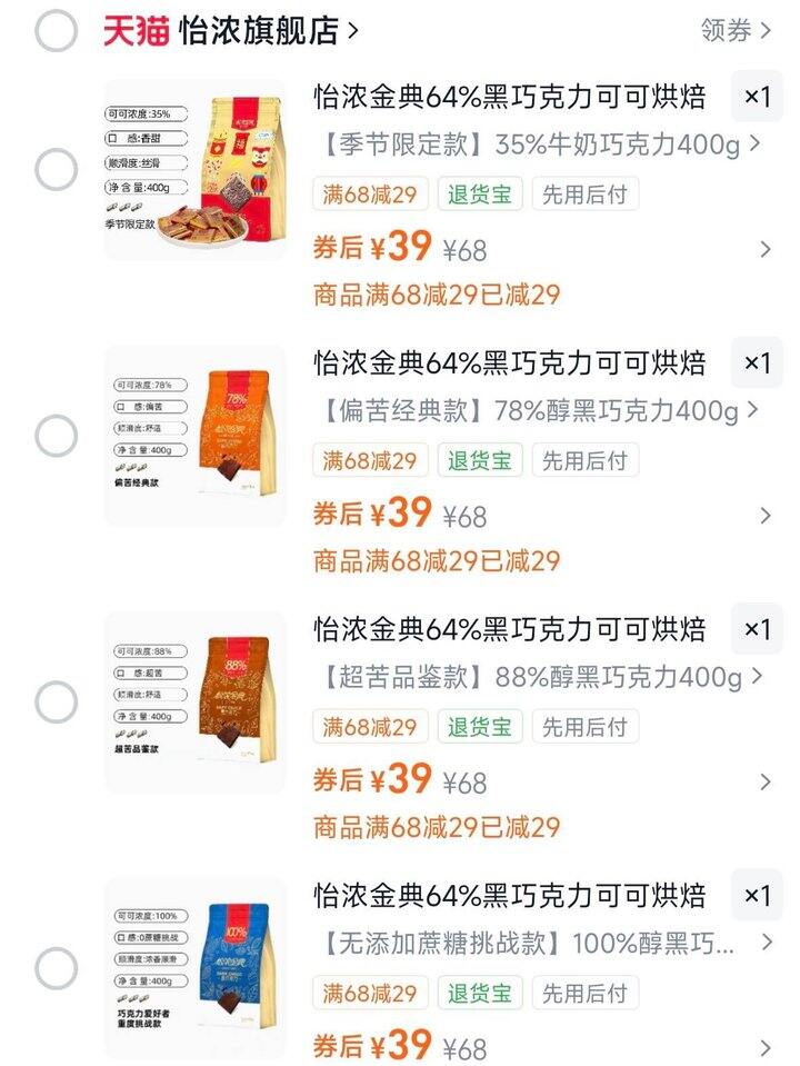 怡浓金典纯可可脂黑巧克力,39