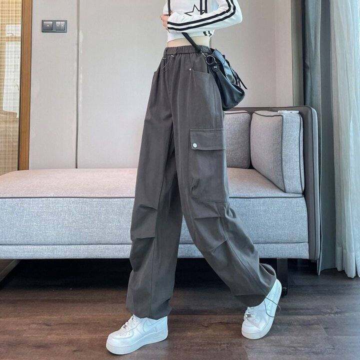 黑色洗水棉束脚工装长裤女款春夏季小个子美式休闲阔腿两穿运动裤