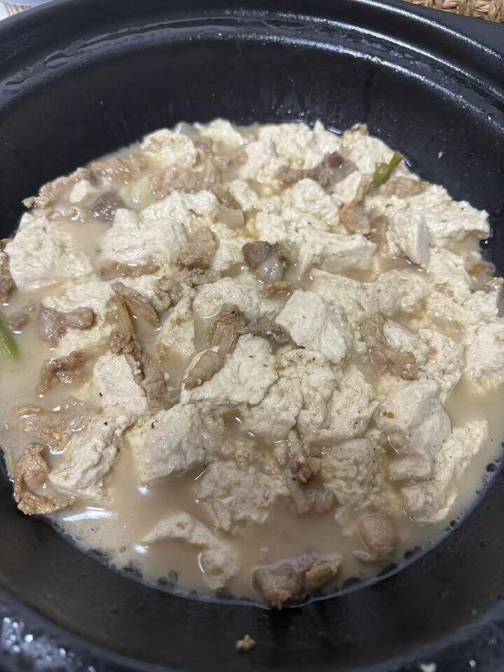 下图是小贩按照抖音里炖豆腐的教程做的(教程里让加八角,这样还能吃出肉香,大家做之前可以搜索看看),因为没加老抽,所以颜色比较白,但是味道很好,买两盒还送一包豆浆,豆浆味很浓~